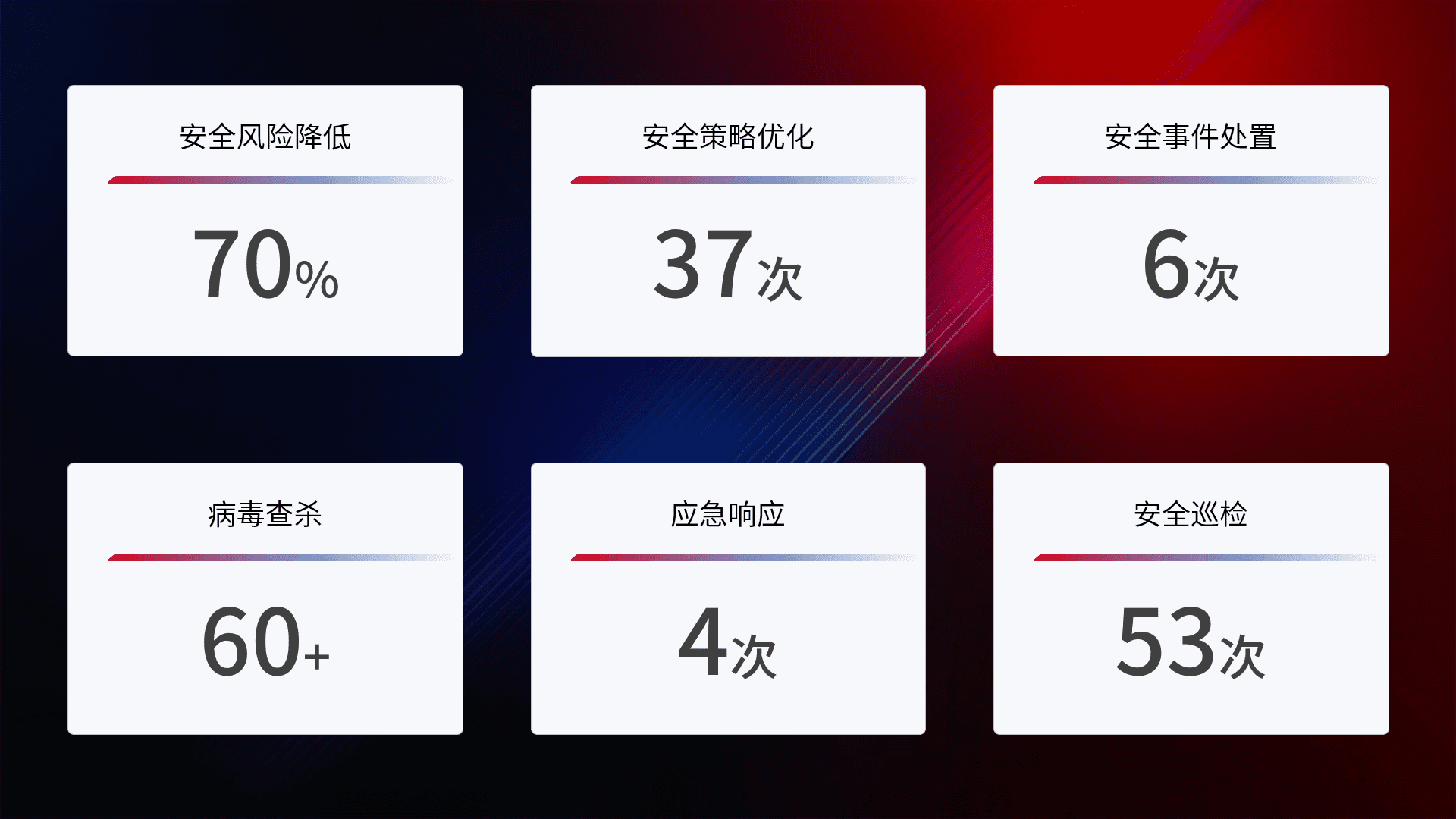 提供全面的安全事件报告体系,,包括处置报告、、周报、、、、季度和年度总结,,结合持续监控,,,帮助客户深入了解网络安全状况。。